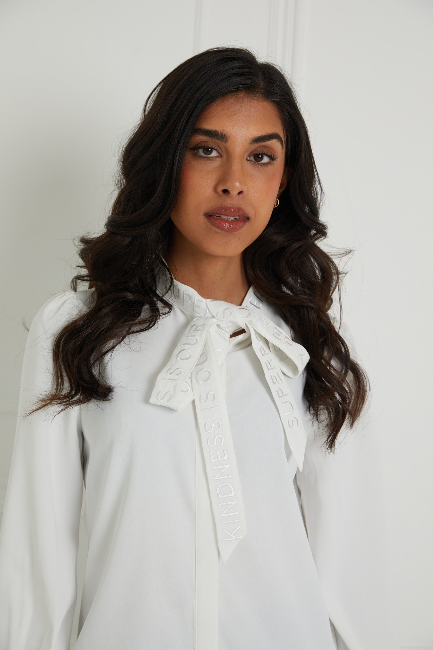 - ‘Kindness is our superpower®’ embroidered bow can be worn as a pussy bow neckline or left loose.