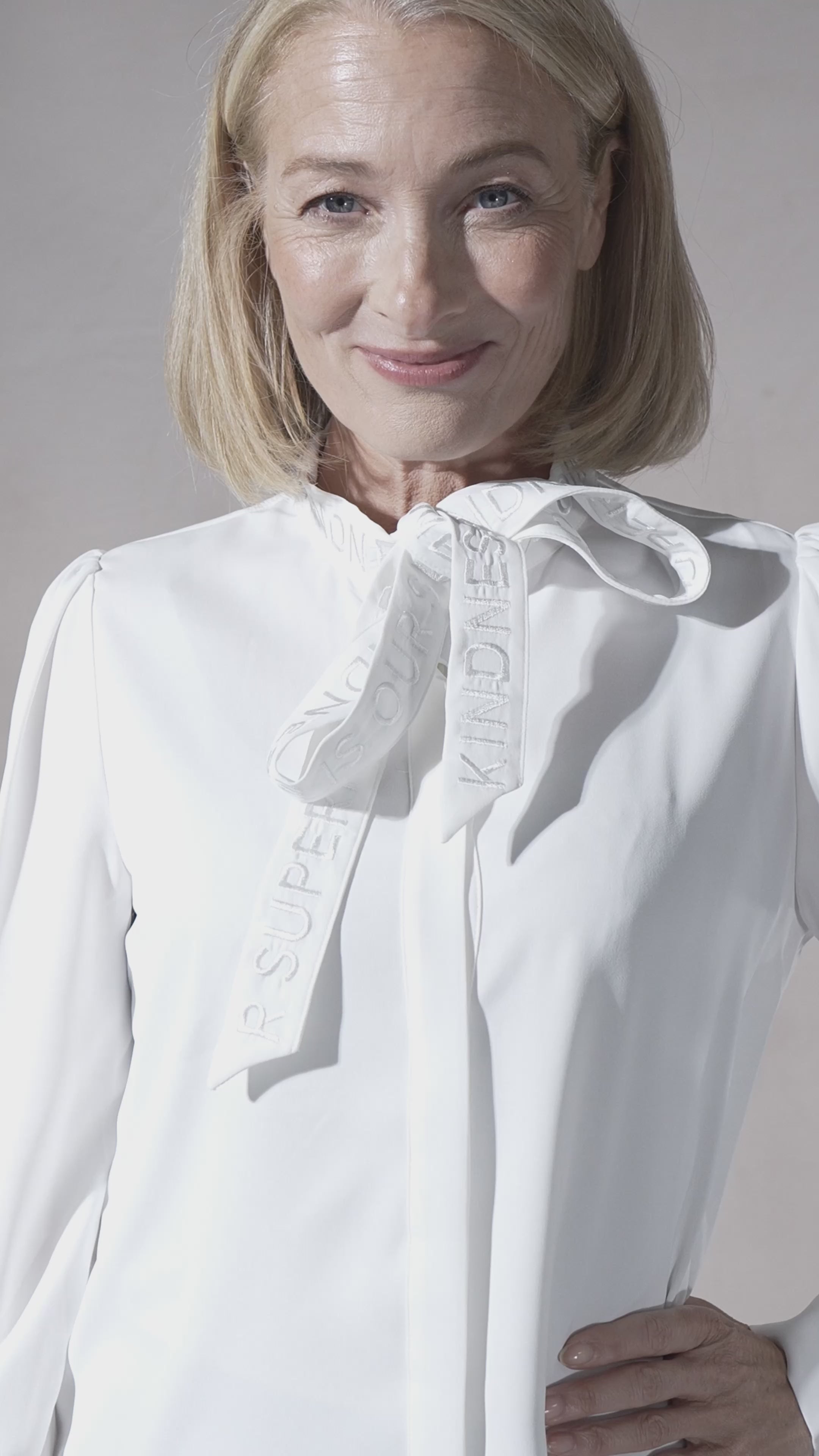 - ‘Kindness is our superpower®’ embroidered bow can be worn as a pussy bow neckline or left loose.